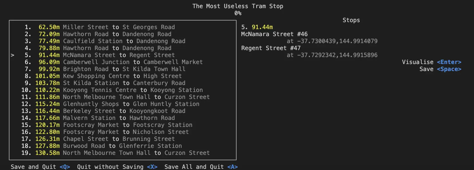 That’s also true for Hawthorn Road to Dandenong Road, also positioned on a T-intersection. These stops are arguably useful, and are arguably less close than my code would make it seem as I only took distances as the crow flies, meaning a straight line. Because these stops are positioned at either side of an intersection, actual passengers would be required to walk further. You can watch YouTuber Qazzy ride this journey in real time.