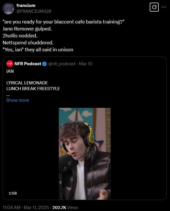 Jane Remover released the Teen Week EP in 2021, before releasing Frailty later that year. Frailty is one of my favourite albums ever—it’s a pretty exact combination of alt rock and Hyperpop and noise pop, which manages to be both lo-fi and anthemic. It dips into these giant serene distorted passages, before coming out the other side in twinkly midi orchestra arrangements. There’s really nothing like it. Jane then changed her name before making a drone project which I still haven’t finished because it gives me ear fatigue. She then leaned hard into industrial hip hop with Revengeseekerz, complete with a Danny Brown feature and a questionable blaccent. I’m sorry, I think the Jane Remover blaccent cafe meme is really funny.